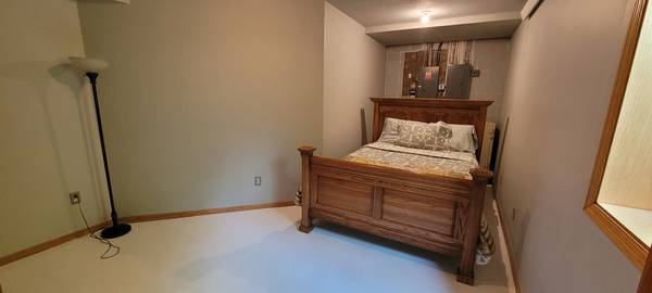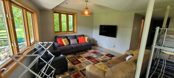 The basement is a wide open floor plan with two bedrooms, 4 bunk beds and a family room. There is a sliding glass door that gives you access to the backyard. There is a bathroom in the basement that has a shower but no tub. There is a washer and dryer in the basement as well.