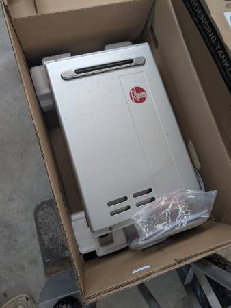 Brand new Rheem (Outdoor) Tankless water heater (meant for outside building) never used 180,000 BTU 8.4gm good for 3 bathrooms in the box new $925 sacrifice for $300
