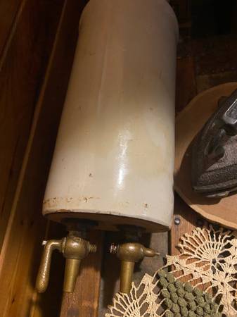 2 very nice old Farm antiques sold together for $120 FIRM included iron and stand Salt barn crock and milk house crock with 2 brass spickets will include iron and stand all 3 No cracks $120...
