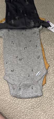brand new three Gerber baby bodysuit. One is gray with the guitar. The other one is gray with music notes and the other one is mustard color with lightning bolts all with tags and hangers from the...
