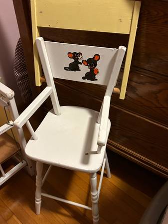Antique doll crib and highchair. Doll crib inside measurement is 24", height is 19". White and yellow in color with painted mice decal on one end. One side goes up/down. Matching white and yellow high chair with mice decal, height is 26". This set was bought new for my girls 40+ years ago. Set is in very good condition. Call/text show contact info
