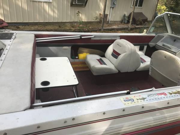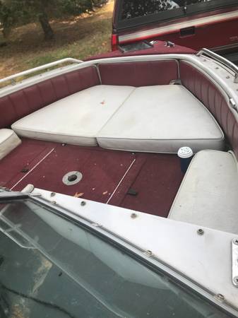 I bought this boat off the showroom floor, it's always been in my possession since new. I have done all the maintenance on this boat, and it has been well cared for. It has been parked in my shed all the time, unless I was at the lake even then it was always covered. I put a water Seperator filter (not all boats have this) before any gas enters the engine, so it has never had any water running thru it! It runs like a charm, always starts and I have never had any problem with it. It has an auto pilot trolling motor, Lowrance GPS dept finder. The roof cover, travel cover, anchors, live well, EZ loader with rollers trailer, I have an electric power winch (worth $900) and cable to load the boat with ease. It has 2 swivel chairs (one not pictured), the back to back bench seat folds down to lay on. I painted a custom hole on both sides with eyes and a spider looking out looks nice! It is just coming out of storage and hasn't been started this year yet. I have no doubt it will start immediately and run flawlessly for anyone who wants a "very reliable" well-maintained boat. I have pulled lots of tubers and 2 skiers with 5 in the boat (years ago). Just don't have the time to use it much anymore. $15,500 or B.O.