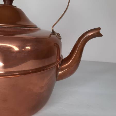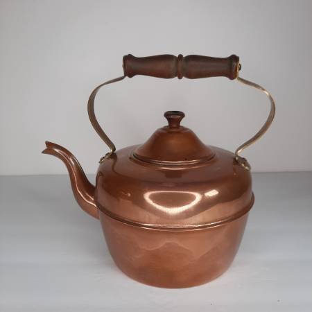 Appears to be copper with nickel(?) interior, with brass and wood handle.