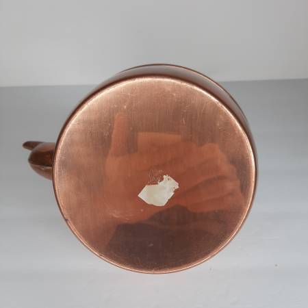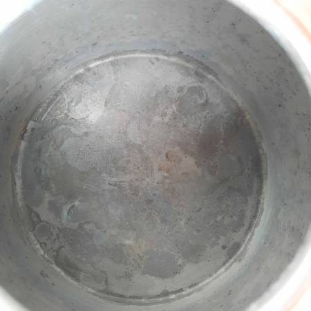 Very good condition. Has some discoloration, spots, and minor scuffs and scratches. The bottom is super shiny. The interior is rather clean. The paint on top of the lid knob is worn off. The wood handle has minimal wear. Please review and zoom into the detailed photos for additional information.