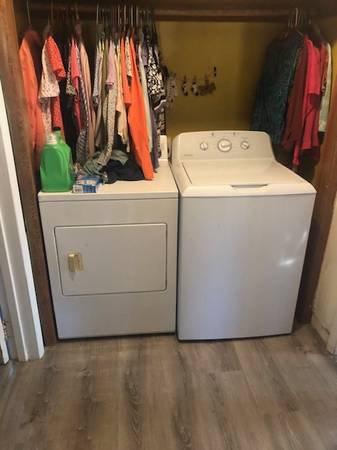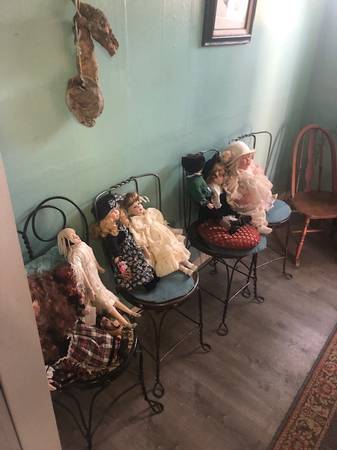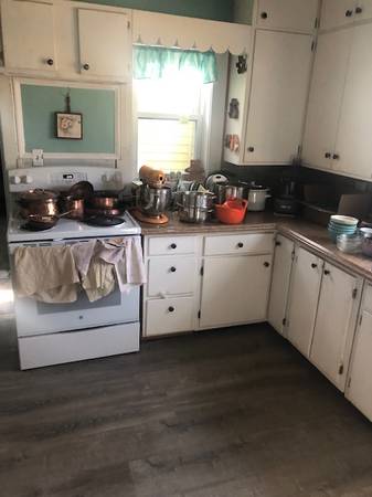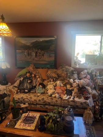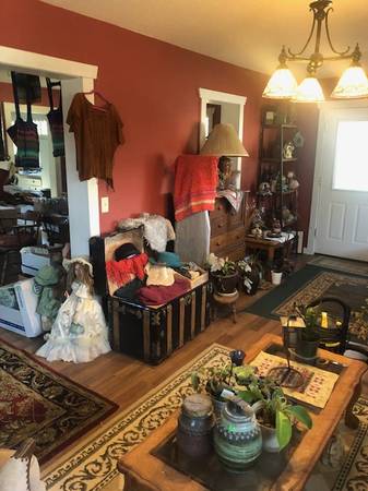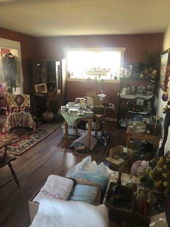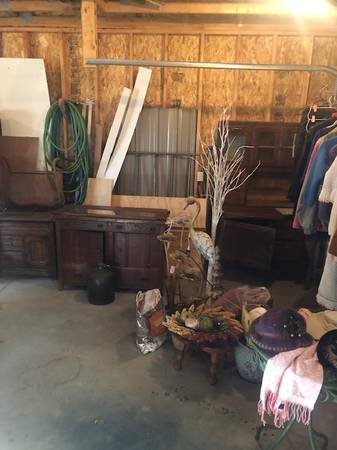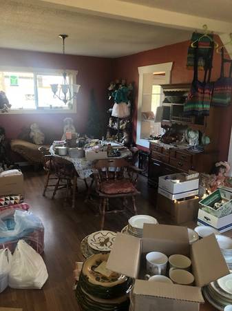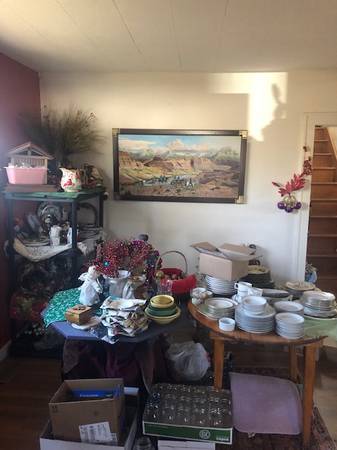 Dishes, mugs, kitchen stuff,pottery, nick knacks, pictures, pots and pans, matching Ethan Allen dining room table 6 chairs/hutch. Furniture; book shelf, dressers, chairs, couch. Bed Frames,Angora yarn.