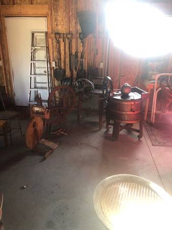 Antiques; (2) 1800 era hand crank washing machines, spinning wheel, dresser, etc.
