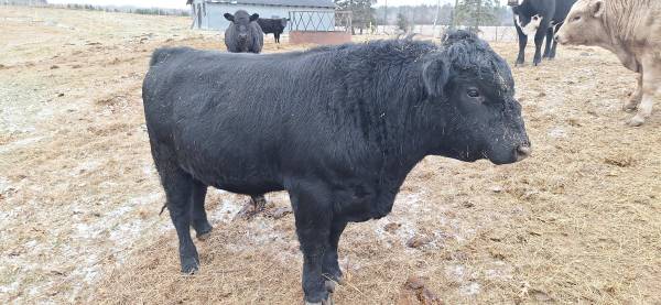 2 year old black bull. Very mild temperament. Will work well with young stock. Calves out of him available to see. Delivery is available.