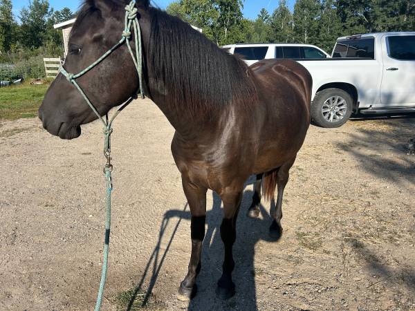Has been started under saddle but definitely needs more training. she’s about 15 hands. She’s an In your pocket type horse, has the goofiest personality and loves her people, food motivated, no buck, bite or rear. She is very level headed and an overall great horse. She needs a more experienced rider on her as she is new to the whole riding thing. She has been around cows, goats, chickens, dogs and other horses and does good. She has been walked on the road and cars have not been an issue for us. She definitely loves to work. I would love to keep her but I am going off to the military and will not be home to give her the love and care she deserves. I
