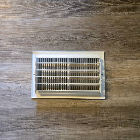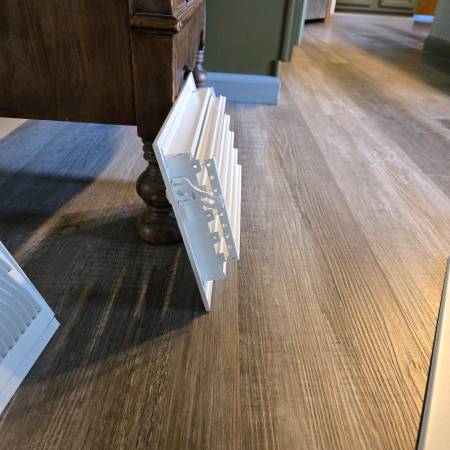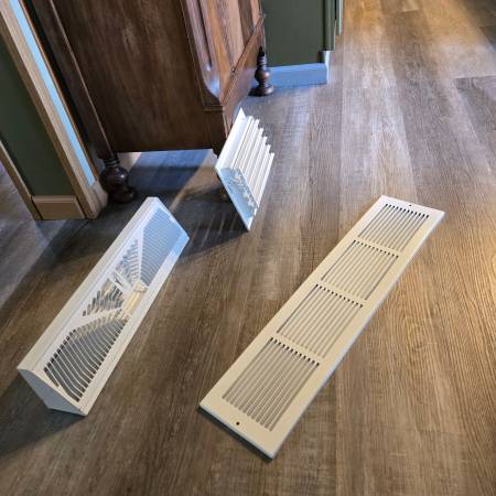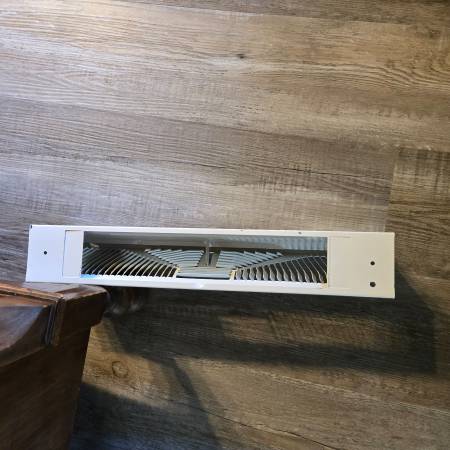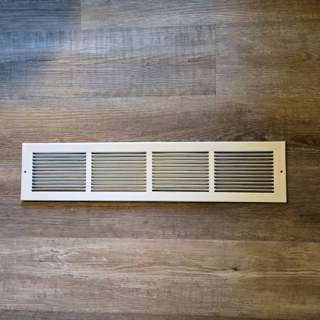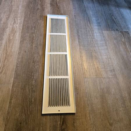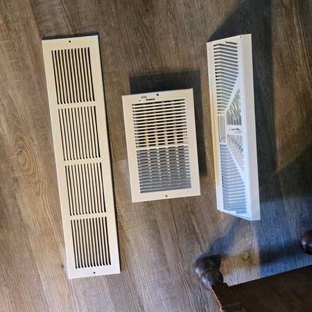 Heater/Air Vents. $5.00 each. Various types and sizes. All white. Standing vents (I have Three of them) Length 18", Height 4 1/2", bottom 3". Long flat vent (I have six of them) 25 3/4" x 5 3/4"....