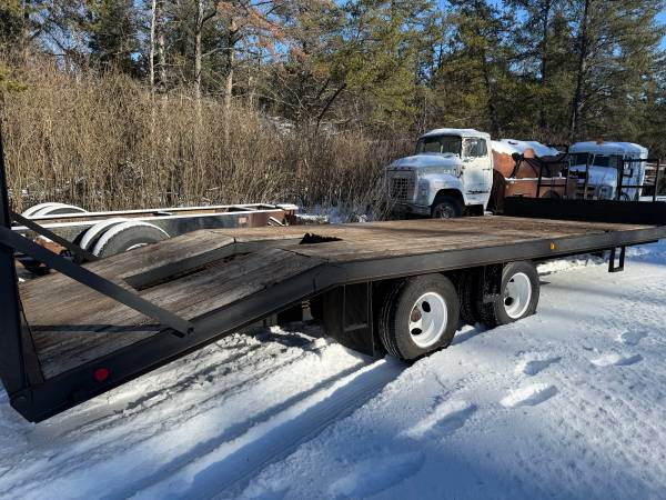 2008 REDI HAUL BACKHOE EQUIPMENT TRAILER, AIR BRAKES, FOLD DOWN LOADING RAMPS, TANDEM AXEL DUAL TIRES, PINTLE RING HITCH, NEW PAINT, DECENT CLEAN TRAILER.