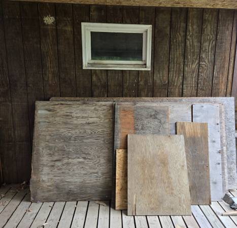 Plywood & OSB. Old but usable. Various sizes and shapes. 4ea - 4x8, 1/2" thick, 1ea - 4x4 1/2" thick, 1ea - 4x8 3/8" thick, other piece's of various sizes.