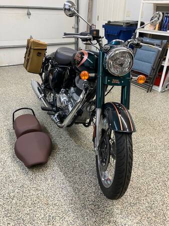 2023 Royal Enfield Classic 350. Enfield saddle bags and deluxe driver seat. Have stock double seat (never used) This little bike is mint.
