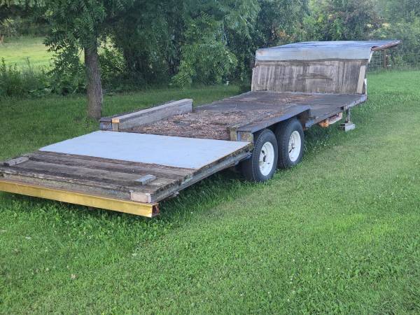 Fifth wheel trailer made from a camper chassis with heavily reinforced deck. Hauled a Case 580 backhoe around with no problems. Elderly and don't use it anymore. Call and make offer.